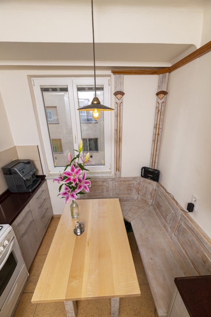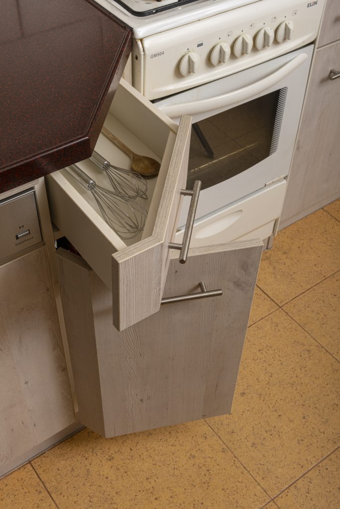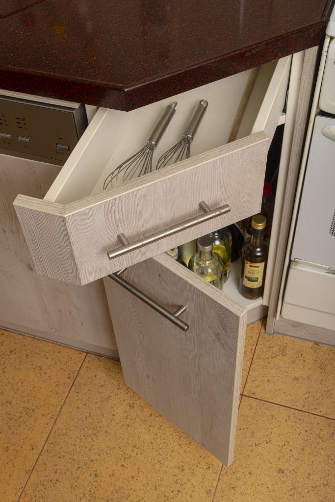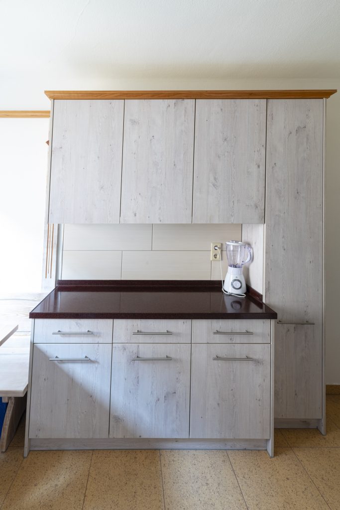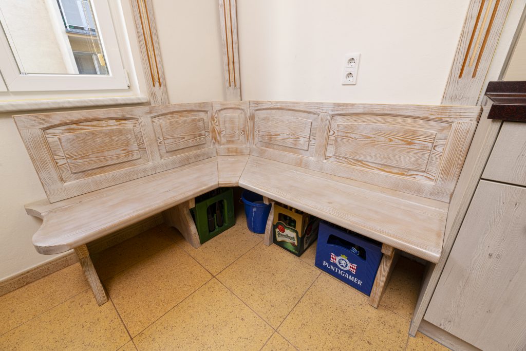 Aus beschichteter Spanplatt Hemmlock, Kunststeinplatte Staron, und Sitzbank aus Fichte gebürstet und Oberfläche an Hemmlockplatte angepasst